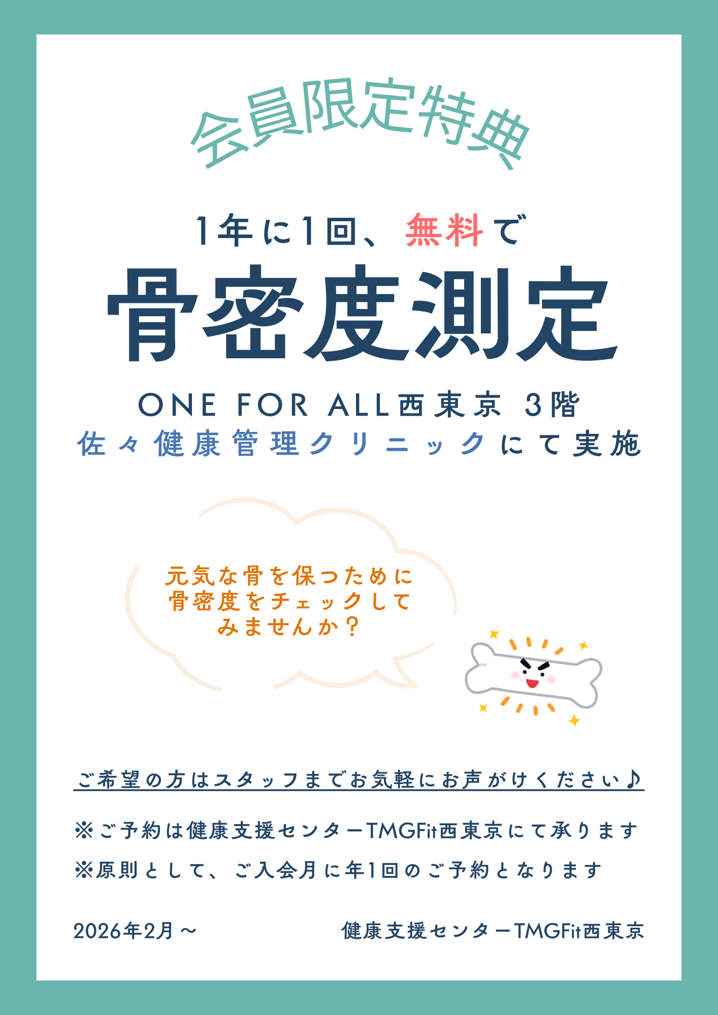 2月から年1回の無料の骨密度測定のお知らせ🦴